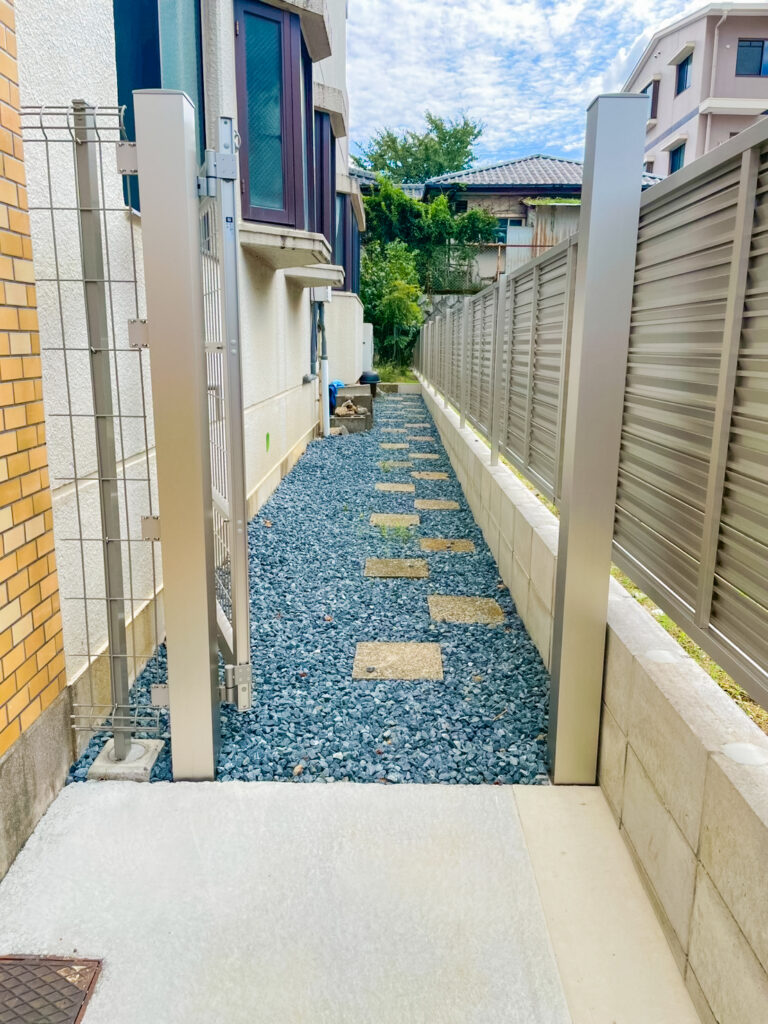 建物外周部には砂利を敷き、歩きやすいように飛び石を設置しました。